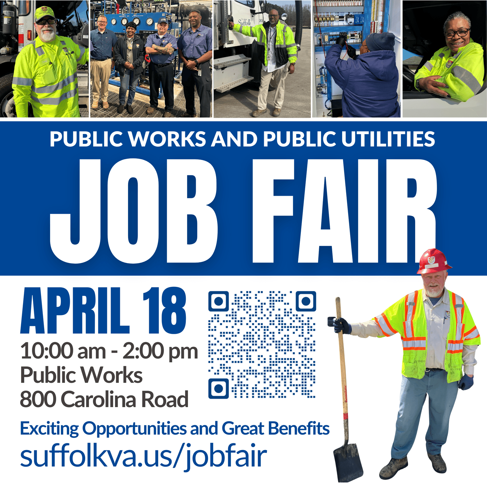 Join us for our Joint Job Fair with Public Works and Utilities on Saturday, April 18, from 10 AM to 2 PM. Come apply, participate in onsite interviews, and meet hiring managers while exploring careers that help keep our community running. Whether you’re starting out or looking for a new path, this is your chance to discover rewarding opportunities in public service—because it is wise to work in Suffolk, VA.